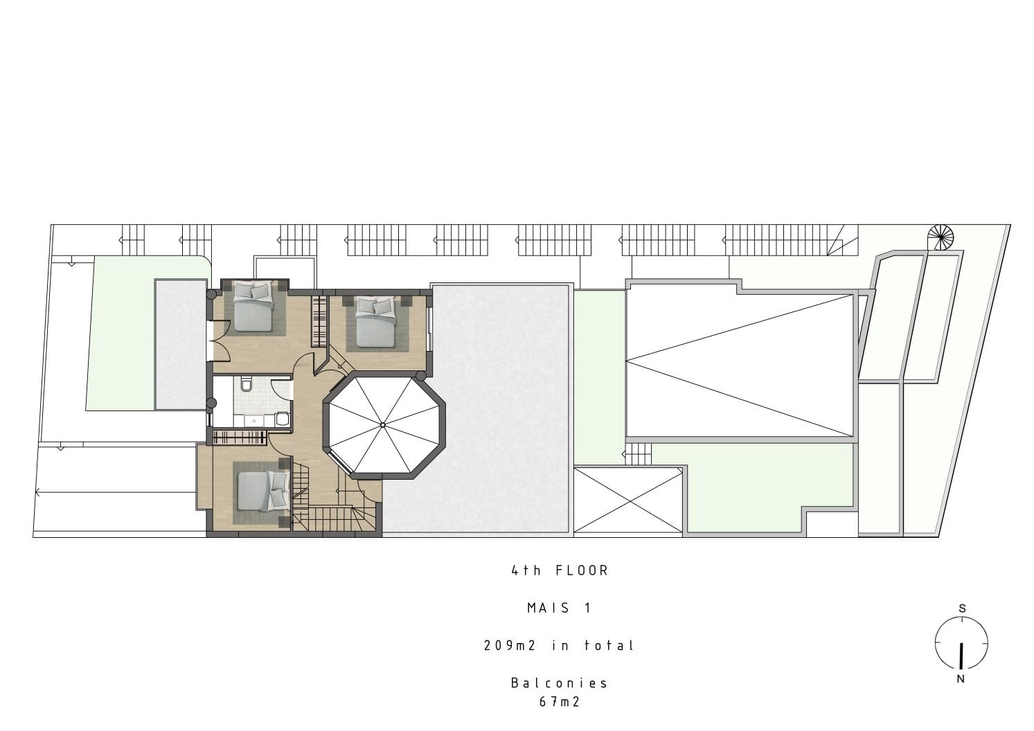 The approach to the design of the building was such so as to ensure the maximum possible view of both the sea and the mountain. The building comprises four double-bedroom apartments