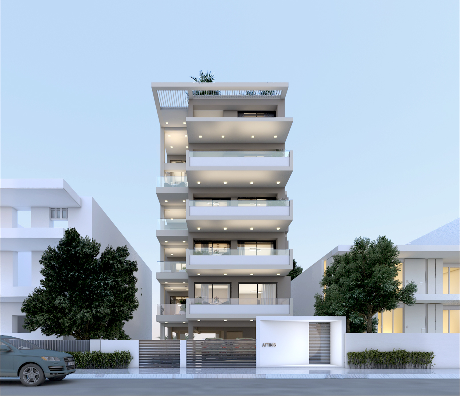 The building is located at the bottom of Mount Hymettus, in a quiet residential area above the bustling center of Glyfada. The favorable south-east orientation of the plot creates an ideal setting for optimal utilization of the daylight and creates a pleasant living space within the apartments.