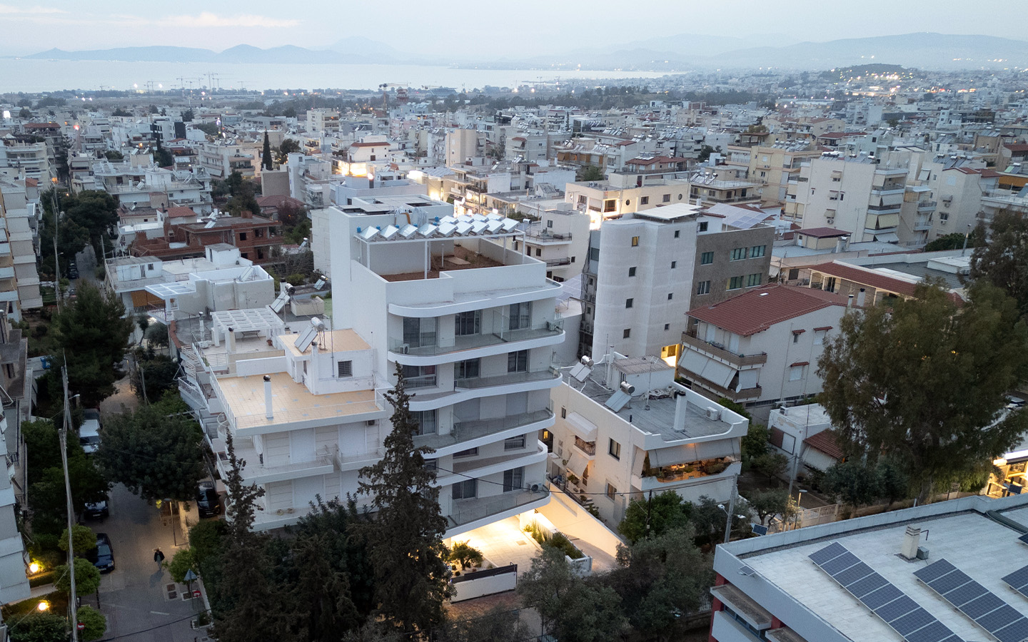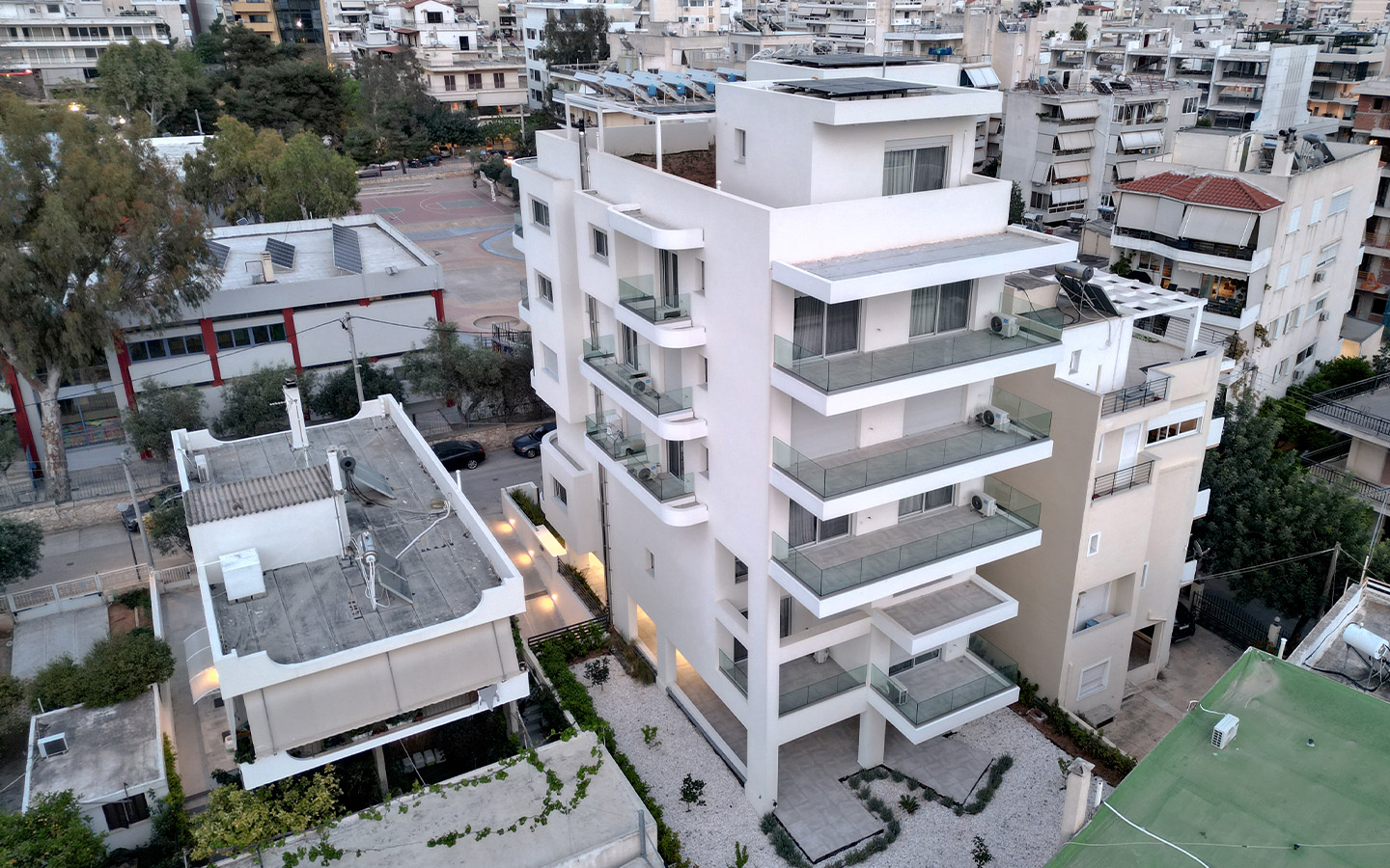 The building is located in the southern part of Athens, close to the forthcoming project of Elliniko. Simultaneously it is positioned adjacent to the main shopping area of Eliniko and in direct coalition with the main trafic axes. The structure comprises of five levels with its orientation facing east. The two top floors view the coastal front of Athens and the saronic bay. The building is of a modern design with influences of contemporary European architecture visible.