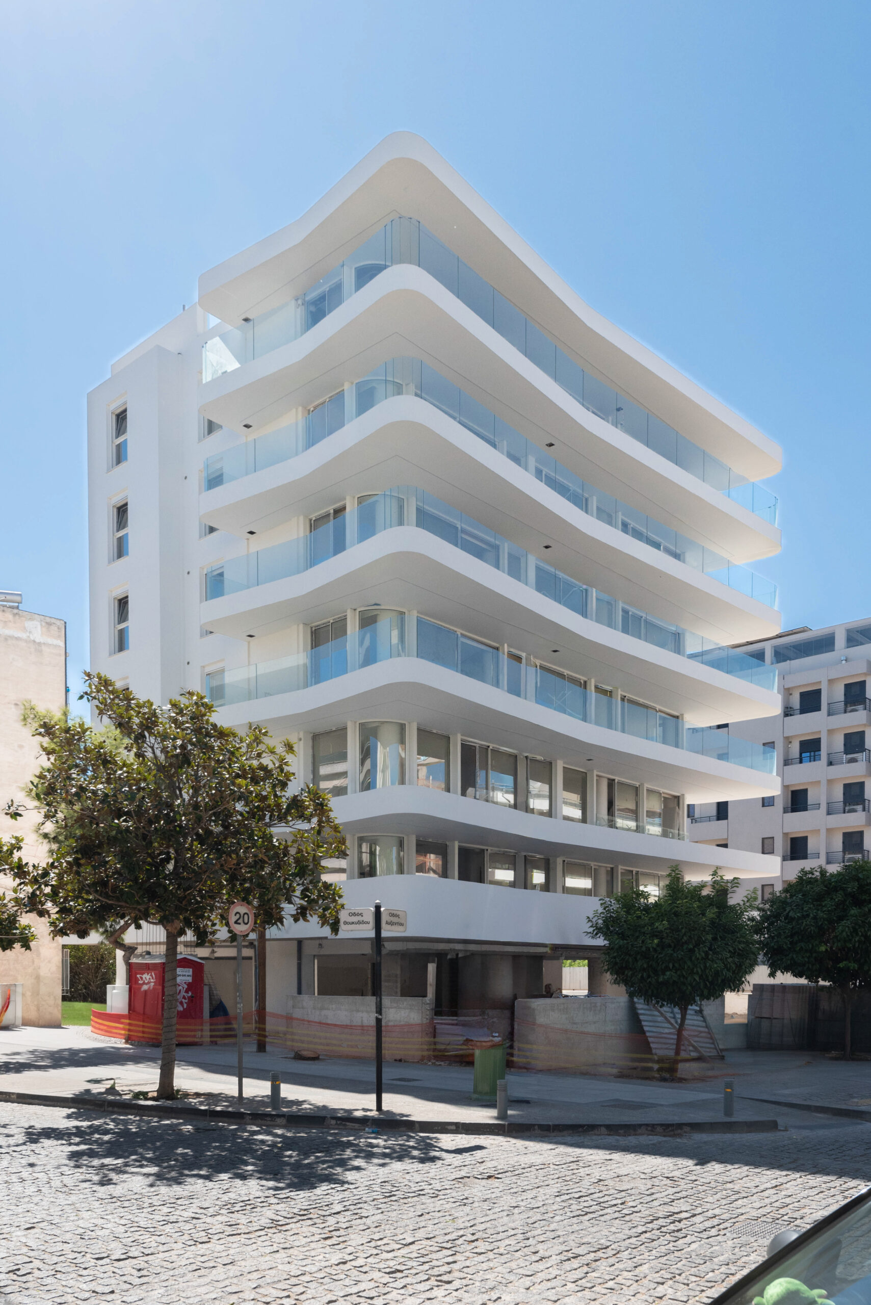 The approach to the design of the building was such so as to ensure the maximum possible view of both the sea and the mountain. To achieve this, its morphology is created by minimizing the solid closed surfaces. Its building materials are glass in most of the facades and white plaster in the small closed parts of the building. The curved balconies combined with the thin profile at the edge give them a light feel throughout the building.