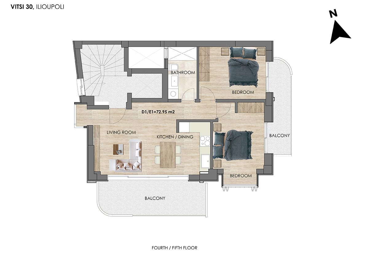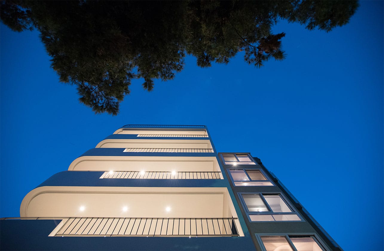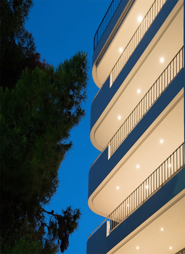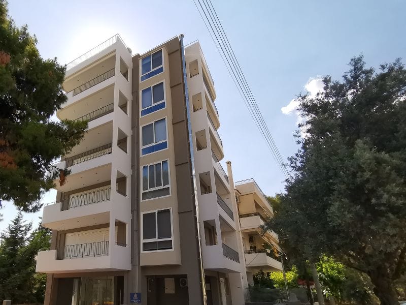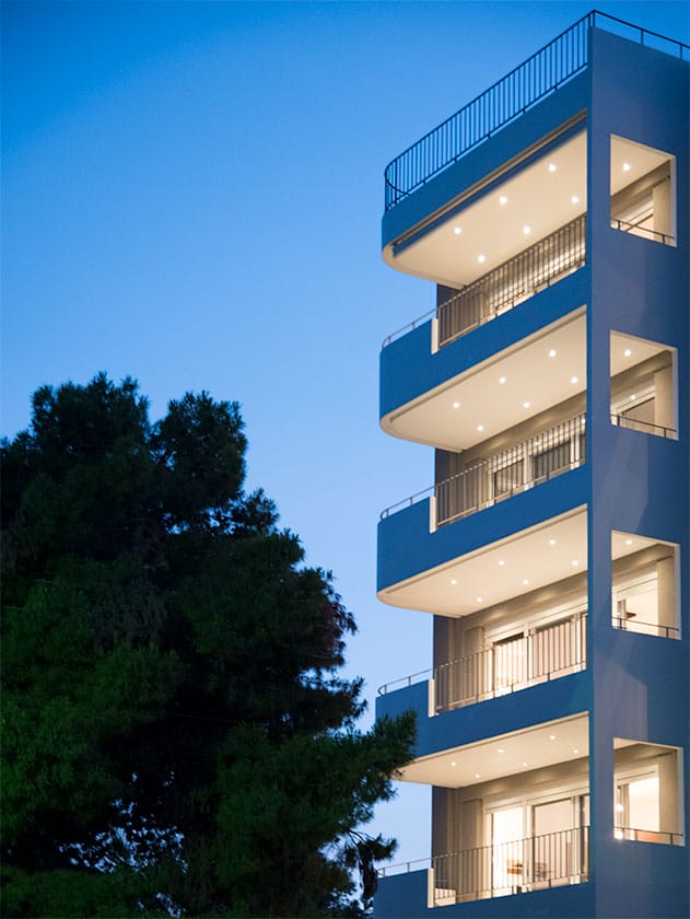 The building is located in the southern part of Athens close to the city center in the area of Ilioupoli which is considered the most refined region due to its immaculate layout. An incredibly outstanding design from every optical angle that ascends into five floors with balconies bordered with generous glass surrounds positioned in the south and east accentuating its uniqueness. Distinctive vertical fissures of varying dimensions are cleverly incorporated on the face of the building giving the visual appearance of an architectural masterpiece. Adding to its meticulous design further attention to detail has been employed in its structure to amplify natural lighting by implementing a vertical wing on the west side. Finally, a shielded contour spans across the face of the building creating an impressive prominent entrance.